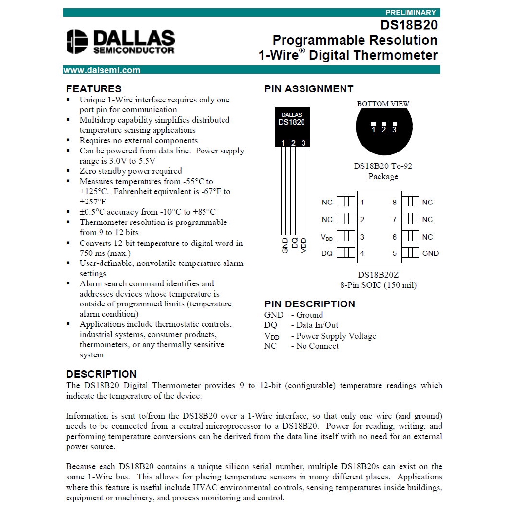 Dallas, alldatasheet, datasheet, datasheet search site for electronic components and semiconductors, integrated circuits, diodes, triacs, and other semiconductors. If this site is good enough to show, please introduce this site to others. The resistor shown in all the circuit diagrams is 4.7k ohm pullup resistor. It is extremely useful if you want to measure temperature within a large area of several 10's of metres, such as a building, since many devices can be attached to a single wire pair. The ds18b20 is a 0.5°c accurate thermometer (this is the same accuracy as the lm35 device).